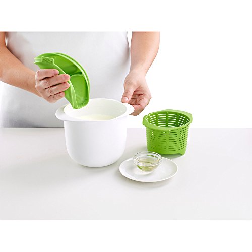 Überraschen Sie sich und Ihre Gäste mit frischem Käse aus der Mikrowelle, mit dem Lékué Käsezubereiter ein Kinderspiel. Er besteht aus nur drei Elementen, einer Plastikschale, in der die Milch erwärmt wird, einem flexiblen Silikondeckel, der zudem als Maß für den Zitronensaft oder Essig dient, und einem Sieb, in dem Sie den Käse formen. Sie benötigen nur wenige Grundzutaten und kein kompliziertes Utensilien-Set. Schon nach nur 15 Minuten Kochzeit in der Mikrowelle, in der der Vorgang beschleunigt wird, und 90 Minuten Ruhezeit im Kühlschrank ist Ihr cremiger Frischkäse genussfertig.Inklusive Rezeptvorschlägen.17 x 14,5 x 13 cm H.