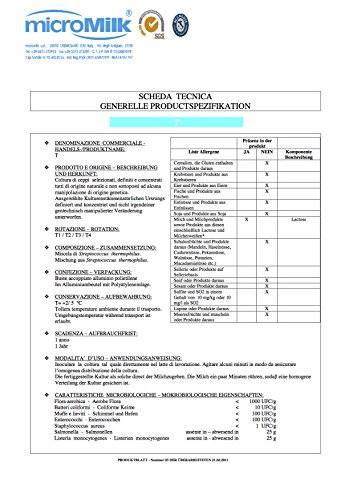 Besuchen Sie unseren Shop, dort finden Sie alles zum Käse, Quark, Frischkäse und Joghurt selber machen! – 1x T1 Thermophile Kultur – für Mozzarella. – Inkl. Videoanleitungen und Rezepte zum Käse selber machen (einfache Schritt für Schritt Anleitungen). Ideal um Mozzarella herzustellen (diese Kultur ist für die Säuerung zuständig und bildet schlussendlich den Geschmack des fertigen Mozzarellas). – Inhalt: 15 g. – gefriergetrocknet (pulverartig). – Dosierung: ca. ½ Teelöffel auf 5 Liter Milch (entspricht ca. 0,5 g). – im Kühlschrank gekühlt und Luftdicht aufbewahren. Hinweis: Um Mozzarella herzustellen, benötigt man zusätzlich Lab und Calcium. Diese Artikel und vieles mehr finden Sie in unserem Shop. Lieferumfang: 1x T1 Thermophile Kultur für Mozzarella Käse in luftdichter Verpackung + 1x Link für Videoanleitungen und Rezepte