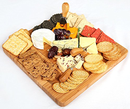 Bewirten Sie Ihre Gäste mit Stil Das Bambus-Käsebrett von Kenley ist eine dekorative und praktische Möglichkeit, Käse und andere köstliche Lebensmittel zu servieren. Die wunderschöne Struktur des 100 % natürlichen Bambusholzes sieht in jeder Umgebung hinreißend aus. Dank der integrierten Schublade haben Sie Ihr Käsemesser stets zur Hand. Das Set umfasst vier rostfreie Bestecke, mit denen Sie jede Art von Käse servieren können: ein Käsemesser für harten Käse, einem speziellen Messer für weichen Käse, einem Spatel und eine Käsegabel. Was für ein hervorragendes Geschenk! Durch die vier Rillen für runde oder eckige Cracker und dem mittigen Käsebrett kann dieses Käsebrett leicht als gemischte Platte mit Käse, Fleisch, Chutneys und anderen Köstlichkeiten verwendet werden. Natürlich können Sie es auch für ganz andere Dinge verwenden, wie für einen Geburtstagskuchen, Früchte, Pasteten, geräucherten Lachs oder Fingerfood. Mit wiederverwendbaren Labels können Sie Informationen zum Käse sowie Nährwertinformationen anbringen. Das geräumige Brett mit den Maßen 33 x 33 cm wurde vor dem Versand eingeölt, damit es leicht zu reinigen und zu pflegen ist. Die Schublade kann zur besseren Reinigung vollständig herausgenommen werden.