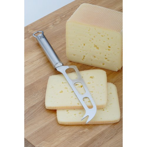 Das Käsemesser aus der Serie Profi Plus von WMF schneidet ganz leicht durch unterschiedliche Käsesorten. Dank des scharfen Wellenschliffs teilen Sie Weichkäse wie Camembert, Romadur oder auch Gorgonzola in sauber geschnittene Stücke. Die Aussparungen in der Mitte der Klinge verhindern, dass der cremige Teil des Käses daran haften bleibt. Aber auch Schnittkäse wie Gouda oder Edamer lassen sich mit dem formstabilen Käsemesser aus Cromargan® in feine Scheiben schneiden. Mit der geschwungenen, zweigeteilten Spitze können Sie den Käse elegant auf den Teller oder das frische Baguette befördern. Für Käseliebhaber – und alle, die zum Dessert oder Buffet eine Käseplatte reichen – ist das Käsemesser von WMF im zeitlosen Design einfach unverzichtbar.